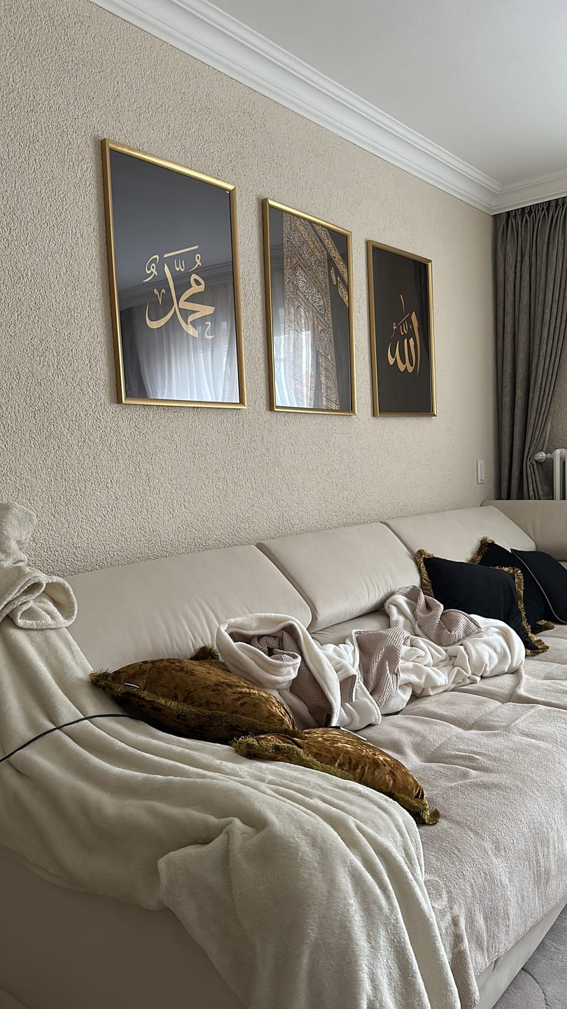 Premium Islamic Calligraphy Frame Set of 1 (13×17 inches) featuring Bismillah, Alhamdulillah & Allah Hu Akbar in elegant Arabic calligraphy. High-quality fade-resistant art print, perfect for Muslim home decor, office walls, mosque, and prayer corner decoration in Pakistan. Ideal 13/17 size for wall hanging. A spiritual, modern and aesthetic calligraphy frame collection for every Muslim household.