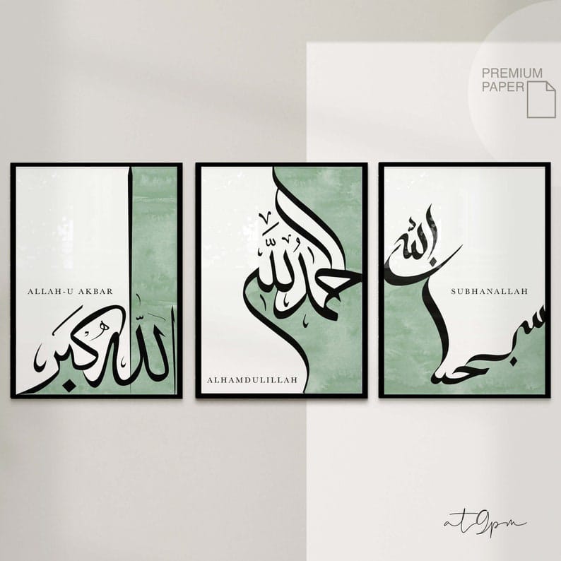 Premium Islamic Calligraphy Frame Set of 3 (12×16 inches) featuring Bismillah, Alhamdulillah & Allah Hu Akbar in elegant Arabic calligraphy. High-quality fade-resistant art print, perfect for Muslim home decor, office walls, mosque, and prayer corner decoration in Pakistan. Ideal 12/16 size for wall hanging. A spiritual, modern and aesthetic calligraphy frame collection for every Muslim household.